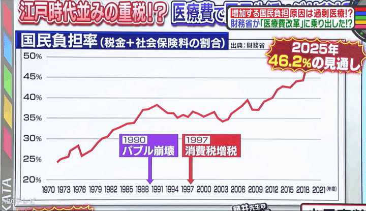 藤井氏は11月22日の「正義のミカタ」で、社会保険料と税金の国民負担率が2025年に46.2%にまで達する見通しだというグラフを紹介。「1万円使おうと思ったら2万円稼がなあかんみたいな話」と指摘していた。