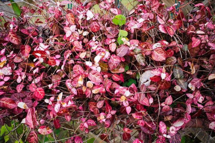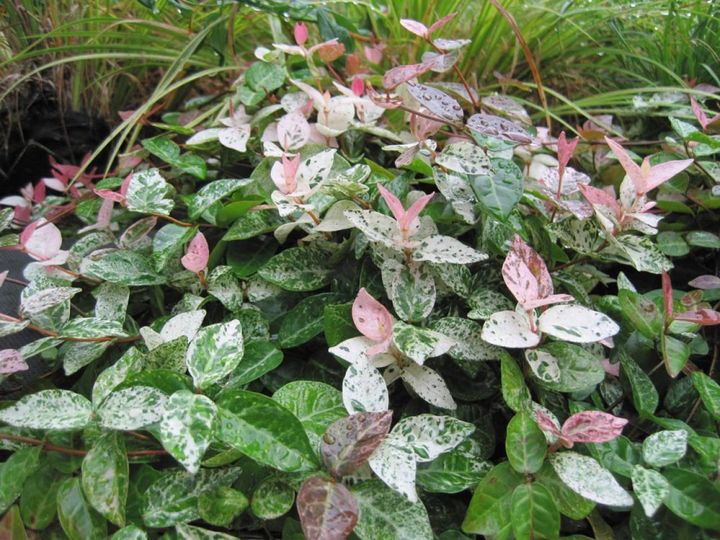 緑葉のテイカカズラの園芸品種。濃いピンクの新葉がやがて薄くなり、さらに緑地に白の斑点と変化して、秋に鮮やかに紅葉します。つる性なのでフェンスに絡めたり、地面に広げたり、寄せ植えに利用できます。日陰では斑の色がよく出ず、夏の強光では葉が傷みやすいのが難点です。
