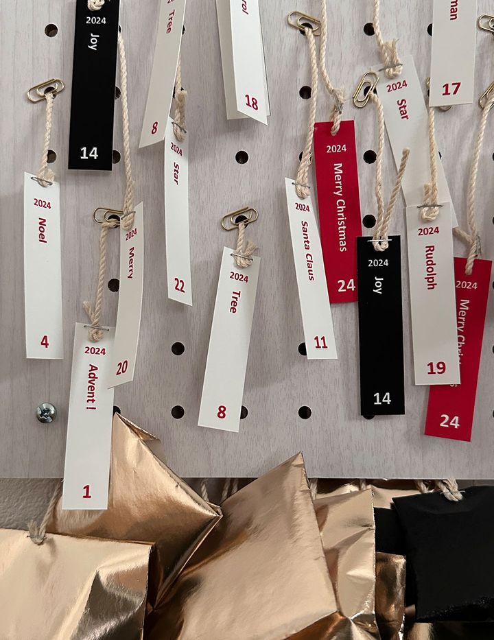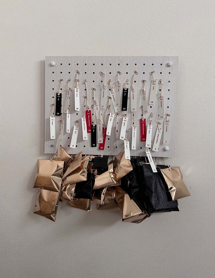 <材料>パンチングボード(ダイソー)、ひも(100円ショップのたこ糸)、包装紙(100円ショップなど)、クリップ、自作のタグ、ホチキス<つくり方>① 入れるものを包装紙で包み、小包を24個つくる。② ホチキスでタグと紐を固定する。③ パンチングボードの表からランダムに紐を穴に通す。④ 通した紐の先に、①をホチキスで止める。⑤ ボードの表から、紐の途中にクリップをつけてストッパーにする。<ポイント>「飾ったときにタグが被らないように、バランスを見て穴に通すと見栄えがいいです。また、袋がどんどん減っていくので、その過程で偏らない(左側だけスカスカなどにならない)ように、満遍なく日付を散りばめるのも大事なポイントです」