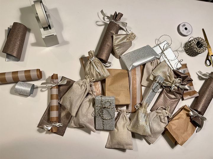 「全体のイメージは色のトーンを合わせ、ナチュラルに仕上げることを意識しました。ラッピングに使ったアイテムはセリアやダイソーで見つけました。プレゼントの形を筒状や箱状などいろいろ混ぜて、ワクワク感を出しました」