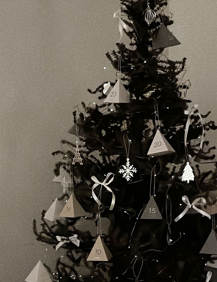 「クリスマスツリーにオーナメントのように飾っています。お家のインテリアに合うように、シックな雰囲気にしたかったので、アドベントカレンダーと、シンプルなオーナメント、白いサテンリボンをところどころに飾って、色味を抑えたコーディネートにしています。ツリー全体にワイヤータイプのライトを巻きつけているので夜も可愛く光って、大人も見ていてテンションが上がります♡ アドベントカレンダーをランダムな配置で飾っているので、数字を探すのもちょっと楽しいみたいです」