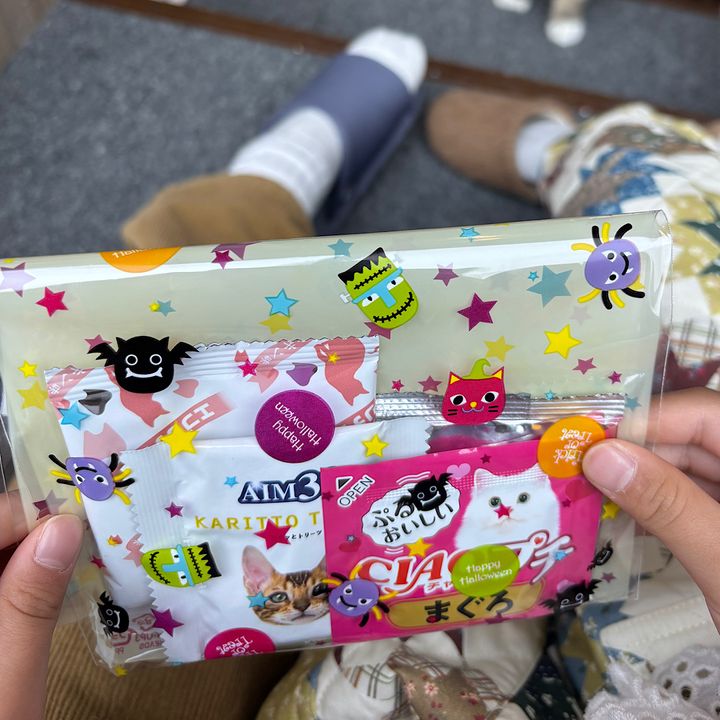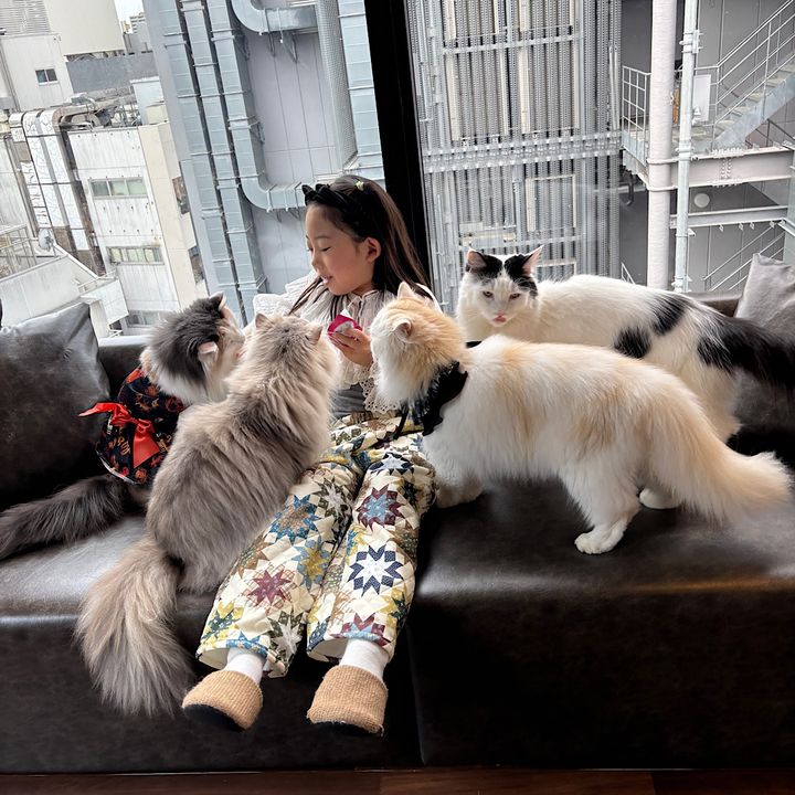 中でもみんな待ちに待ってるチュールを出すと、たくさんの猫ちゃんがどんどん集まってきて、娘もこの日1番の幸せタイムに♡