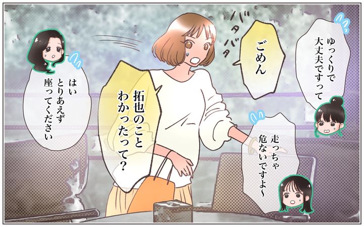 経営パートナーの由香里と順調に事業を広げていた朋子。二人目妊娠をきっかけに経歴が申し分ない拓也を入社させたのだが、由香里と拓也が既婚者同士でありながら交際していると宣言。だが拓也は由香里に暴言を浴びせ続けており、みかねた朋子が拓也をクビにしようとすると、由香里は拓也をかばい会社の株を拓也に譲渡すると言い出して…。もともと拓也の狙いは会社の乗っ取りだったのだ。話を聞いた佳純たちが拓也を怪しみ経歴を検索すると、詐称があることが明らかに。いっぽう朋子には毎日のように拓也から罵倒の電話がきており、妊娠中の心身に大きな負担となっていく。