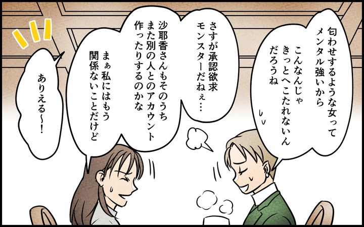 離婚して半年後。匂わせ女は削除していたアカウントを復活させ、すでに新しい匂わせを始めているようです。もう私には何の関係もないことですが…、友人が言っていたように本当に承認欲求モンスターは、こんなことじゃへこたれないんだなと呆れてしまいました。これ以上、匂わせ女の犠牲者が増えないことを祈るばかりです…。