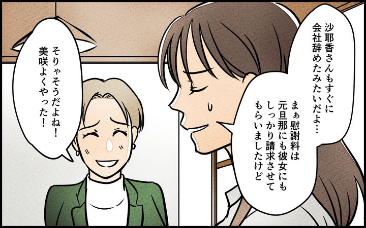 元夫は会社で噂が回り立場もなくなり休職に追い込まれました。もちろん元夫にも匂わせ女にもきっちりと慰謝料を請求しました。