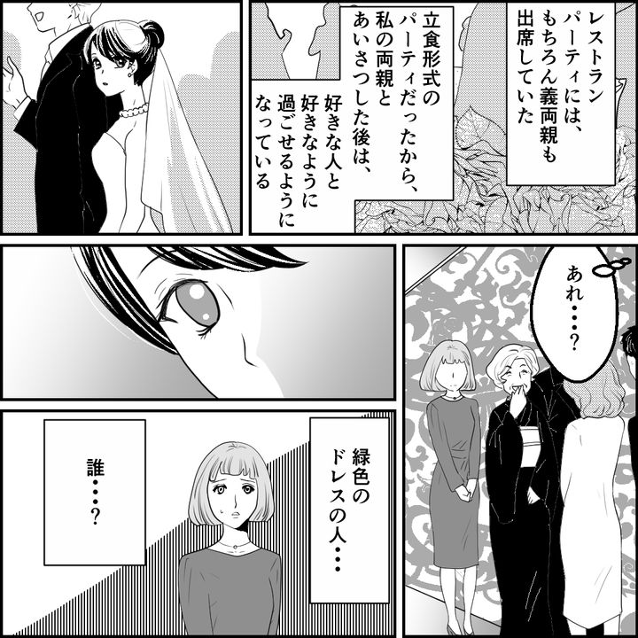 2. 緑のドレスを着た見知らぬ女性が結婚式に参列…一体誰なの?【旦那の元カノ大好き義母 Vol.9】