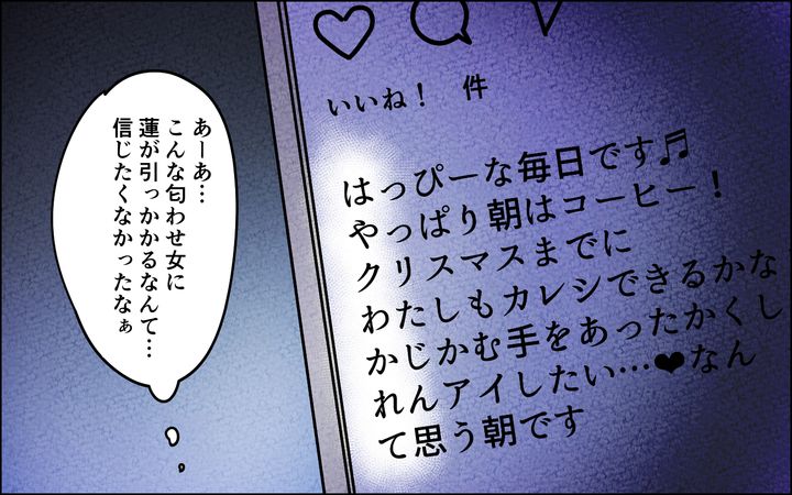 私はずっと蓮の手を繋いできたから…。あの手が本当に大好きだったからこそ、匂わせ女のSNSに映っている男性の手が蓮だと確信してしまいました。