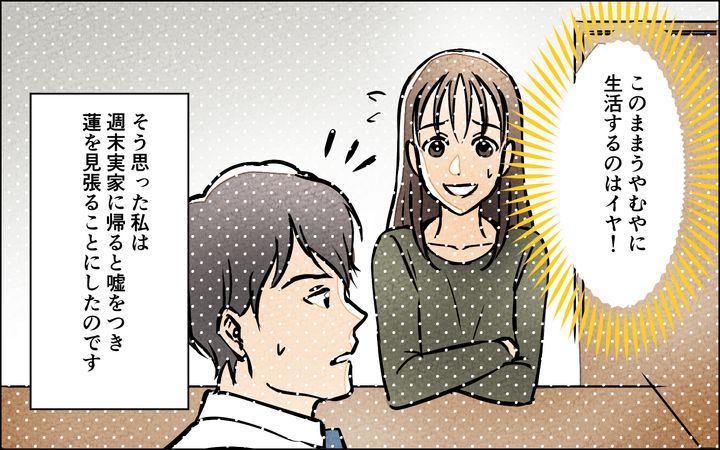 このままうやむやにするのは絶対に嫌! そう思った私は「実家に帰る」と嘘をつき家を出たふりをして、夫が匂わせ女のもとへ会いに行く現場を突き止めるつもりでした。きっとどこかで会うはずだから、2人が会っている証拠を手に入れようと思っていたのです。