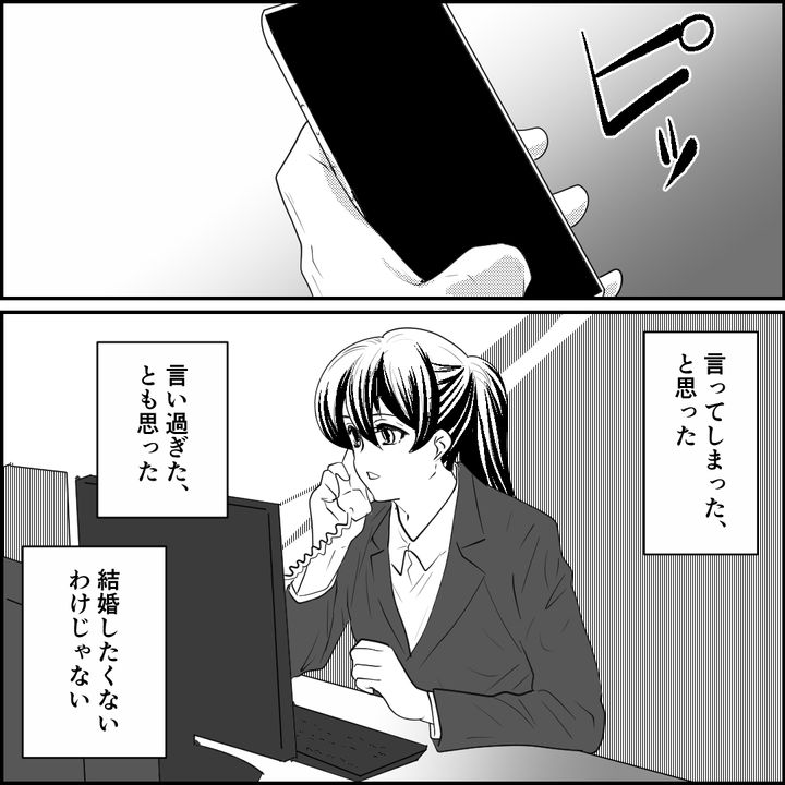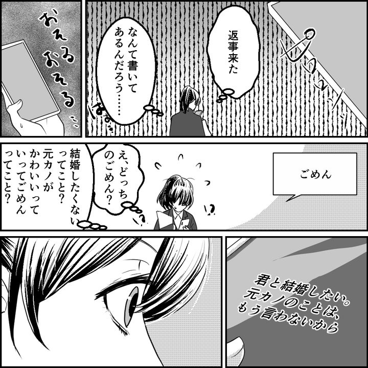 自分の正直な気持ちを伝えてから返信が来るまでの時間、どれだけドキドキしたことでしょう…。別れるしかないのかと考えていたアイさんに届いたのは、「君と結婚したい」というメッセージ。これでようやくふりだしです。