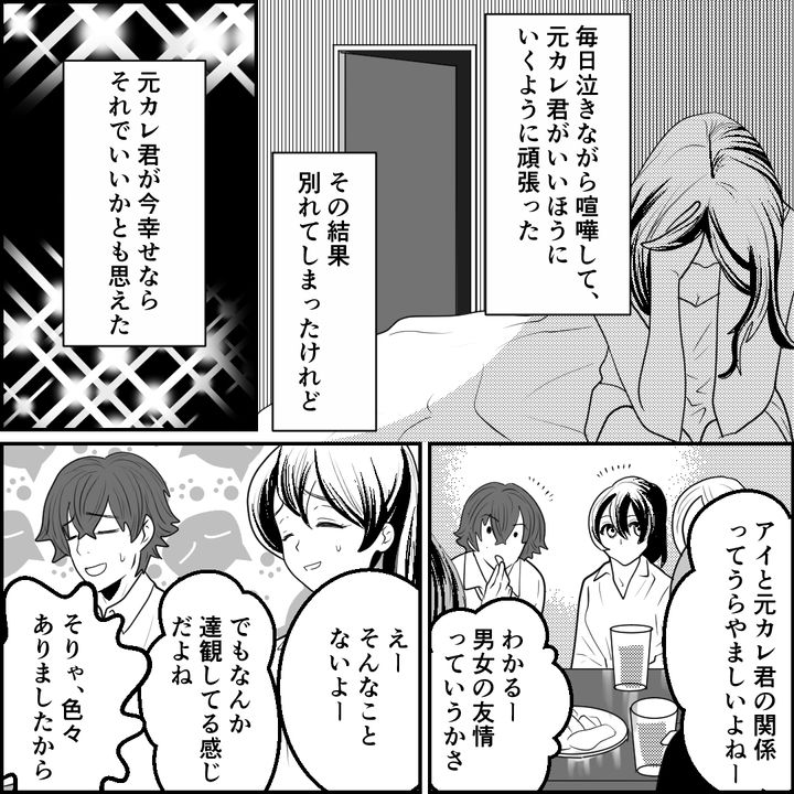 結婚の話が進むに連れて、アイは幸せムードに浮かれて義母の元カノ発言を忘れていく。そんなある日、久しぶりに会った元カレからご飯に誘われる。「結婚するから」と一度は断るアイだったが、女友達もいることがことがわかり参加することに。食事会では友人からたくさんの祝福や優しい言葉をかけられ、アイはあらためて学生時代の友達の大切さを実感する。一方、元カレからは「ちゃんと幸せになってもらわないと困る」と念を押される。なぜならアイには、遊んでばかりいた元カレを更生させた過去があって…。