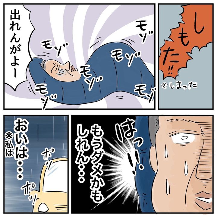 娘の家に宿泊した後、父はスタンプラリーなどを楽しみながら道の駅で車中泊して北海道を目指していた。ある夜、キャンピングカーに挟まれた形で車中泊した際、念願の寝袋を利用したところトラブルが起きて…!?