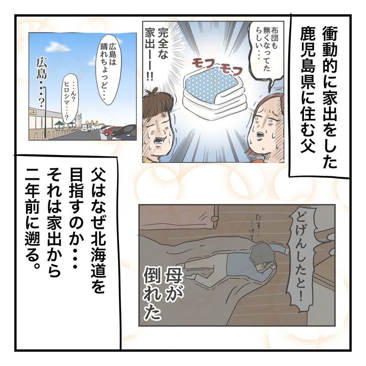 広島の後、父は関西にある長男の家に滞在し、北海道を目指すと言う。なぜ北海道なのか。それは2年前、父の退職祝いで夫婦で北海道旅行を計画していたのだが、旅行3日前に母が倒れてしまったことに関係すると思い…。