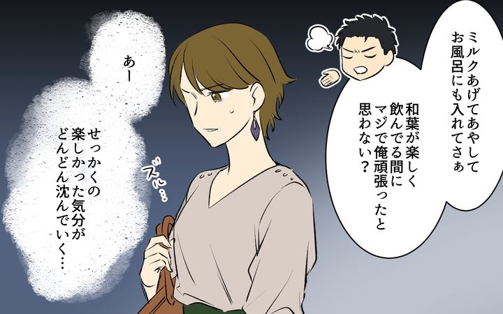 妊娠以来行っていなかった友達との夜の飲み会に、本当に久しぶりに参加した和葉。お酒はまだ飲めないものの、ひさしぶりに自由な雰囲気を楽しみ、好きなものを食べて楽しく過ごしていた。夕飯などの準備はしてきたし、夫も一通り娘の世話はできるのでゆっくりできると思っていたのだが…なんとなく娘と夫が気になって、友人たちより一足先に帰宅することに。そして帰り道、スマホをチェックすると、夫からの大量に連絡が来ていたのだった。