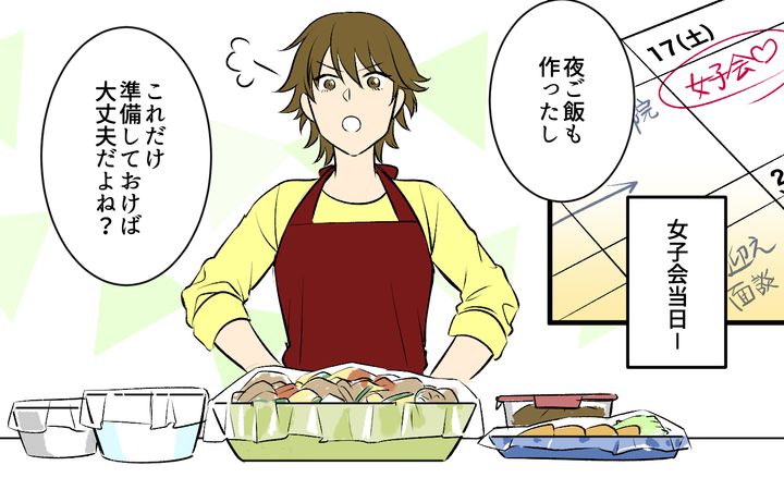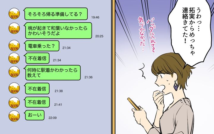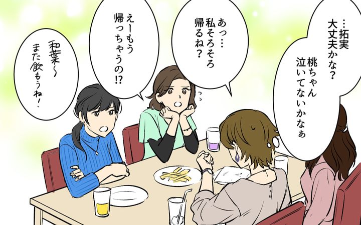 自分は好き放題飲み会に行くくせに、和葉が妊娠・出産以来本当にひさしぶりの飲み会に参加しようとすると、「母親の自覚がない」だの「会社の女性たちは飲み会に来ないのに」など文句を言う拓実。「こんなことを言う人だったんだ…」とうんざりする和葉。お互い親なのは同じなのに、母親というだけで自分だけ我慢を強いられるのはおかしい、と拓実の反対を押し切って飲み会に行った和葉だが…。