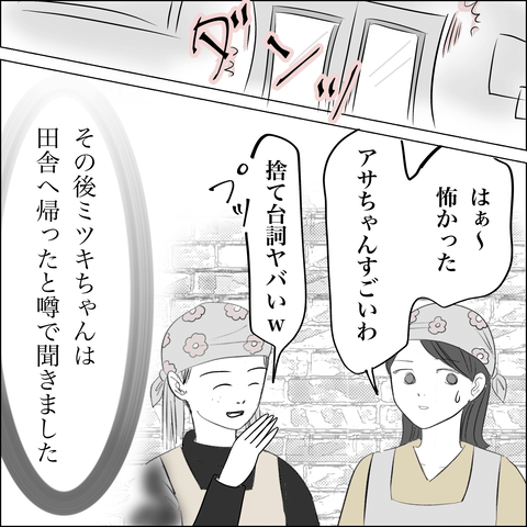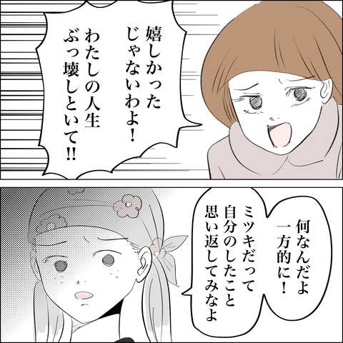 自分のしてきたことを棚に上げて逆上するミツキに対し「慰謝料請求されないだけありがたいと思え!」とド正論で返すアサ。