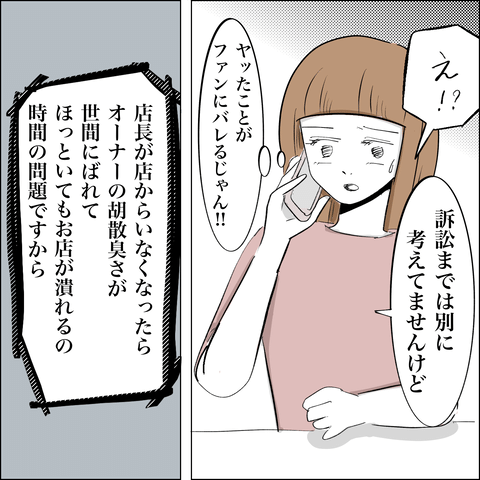 ある日、夫とミツキの関係を目撃したハルナ。他にも調べるとアツシは不特定多数の女子を持っていたことが判明。夫に離婚を突きつけ、泣く泣くお店の権利を夫に譲渡。しかし、離婚後お店の評判はガタ落ちでSNSは大炎上!