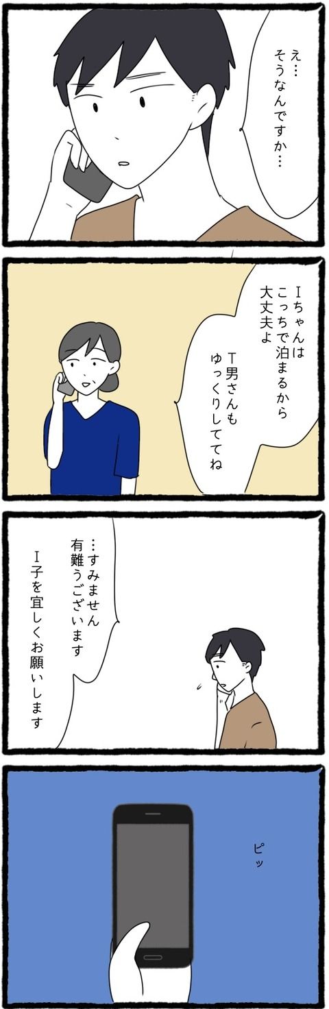 夫の仕事が休みだというのに、行き先も告げず家を出たというW子。母は、事情を知らない夫に娘・I子を預かっていること、W子は朝まで帰らないことを伝えたのでした。