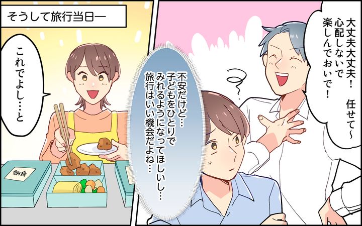 常日頃迷惑をかけられている私にとって、今回の旅行はご褒美であるとともに、ひとりで家事育児をするということを夫にわからせるいい機会だと思いました。一緒にいるとどうしても私が主導で動くことが多いため、夫にも自分で考えて動けるようになってほしかったのです。