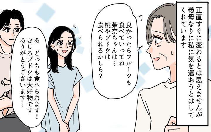 正直、義母の性格がすぐに変わるとは思えませんし、わかり合えないこともあります。それでも、都合の悪い何かを私のせいにすれば、夫と義父が私より先に言い返してくれる。そんな心強い味方が近くにいることで、義母との付き合いも自分なりに割り切れるようになりました。