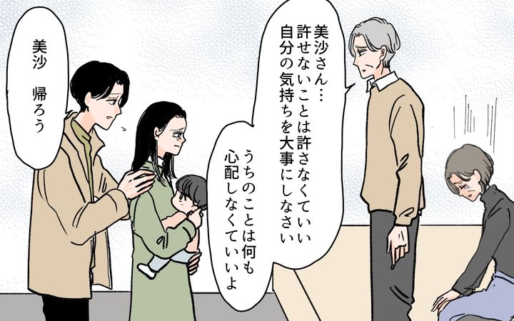 家族だからと言って何をしても許されるわけではない。自分の幸せばかりでなく、美沙の幸せも考えるべきだ、と義母を諭した義父。義母の脳裏に幼いころの和仁の姿がよぎり、義母は「ごめんなさい」と頭を下げた。