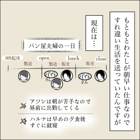 4つ年下の夫、アツシと結婚した主人公ハルナ。夫はフリーランスで広告関係の仕事をしていましたが、プライドが高いうえに、少しだらしないところがあり、結婚後には閑古鳥状態に。これを機にハルナ念願のパン屋を夫婦でオープンさせました。