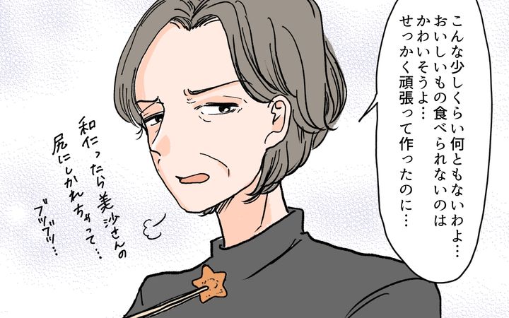 和仁に注意されて逆上した義母は「家族のために妻はおおらかでないと」と美沙を注意した。しばらくは義父母と会わないでいたが、茉奈の1歳の誕生日に再び会う。久しぶりに会った義母は会うなり和仁が太ったと美沙に文句を言うのだった。