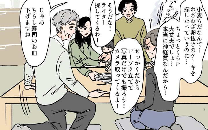 小麦の入った食材も食べられないことを義母に伝えれば「アレルギーは卵しか聞いていない!」とへそを曲げる始末…。「誕生日の写真だけでも撮ろう」という義父の提案で、ピリピリした雰囲気が少し柔らかくなったのですが…。
