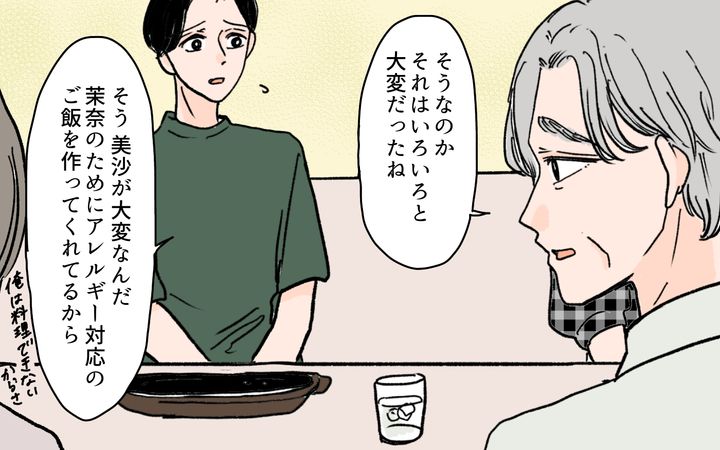 離乳食を開始したことで、娘の卵と小麦のアレルギーが発覚…。和仁さんはそのことを両親に伝えますが、「うちの家系にアレルギーはいないのに、かわいそう」と義母が美沙さんに言い放って…。