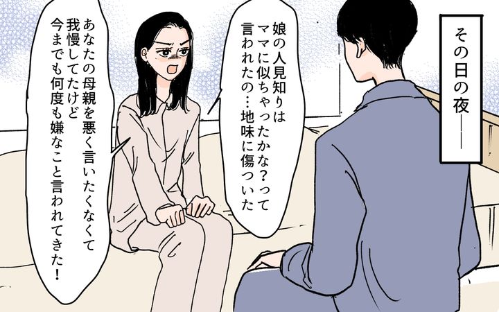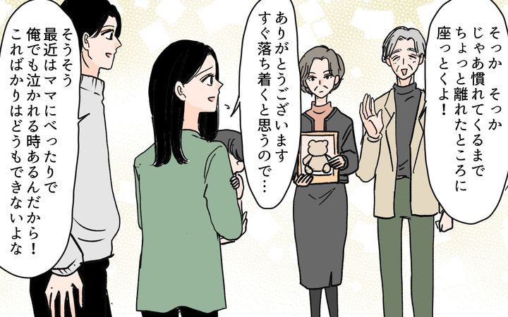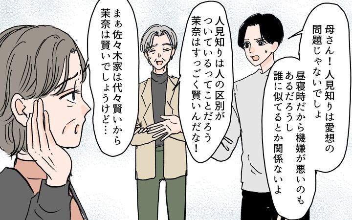 久々に会えた孫に泣かれて嫌な思いをしたのかもしれませんが、「人見知りはママに似ちゃったのかな?」と目の前で言われるとは思いませんでした。義母に茉奈を触らせたくないと嫌悪感でいっぱいになった私…。夫は私の苛立ちに気づいたのか、義母に注意していましたが…。