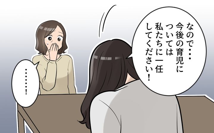 「自分がそっちに引っ越して孫の面倒を見る」と言い出した義母を、やんわり止めようとする美咲。しかし義母は、職場復帰する美咲のこともフォローできるし、一石二鳥だとノリノリで…。そんな義母の“心配性ぶり”に耐えられなくなった美咲は、夫に「私の話を聞いてほしい」と訴える。