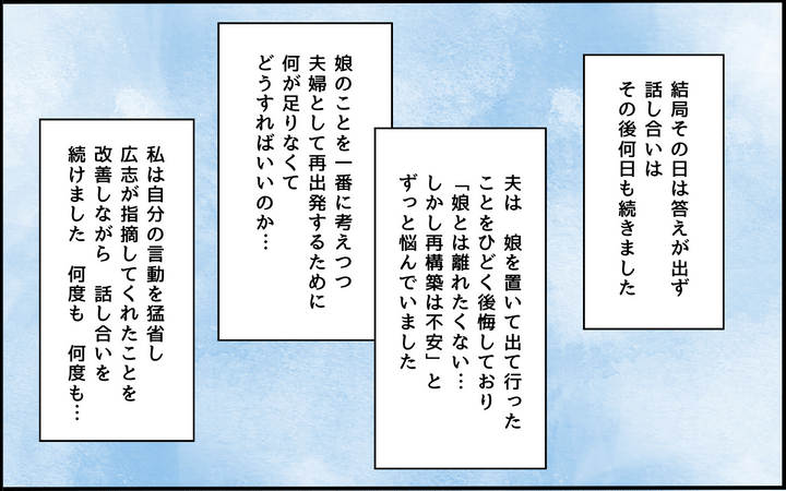 ある日、耐えきれなくなった広志さんが家出。ようやく帰ってきましたが、夫婦の再構築はできるのでしょうか…?