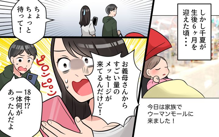 娘・千夏が生後2ヶ月を迎えた頃、お宮参りへ。義母は、千夏が熱中症にならないかと必要以上に心配したり、食事の席で「母乳の話題」を挙げたりと、配慮のない言動を繰り返す。しかし、夫は何も気にしていない様子で、美咲は義母に対して「早く帰って!」と心の中で嘆くしかなかった。