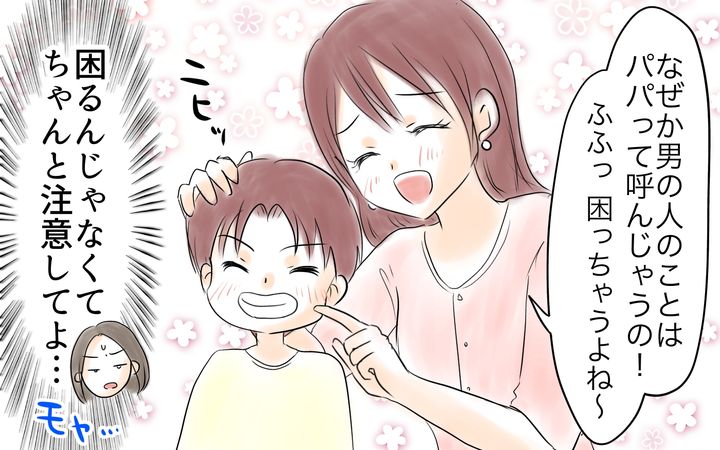 私が樹くんのパパ呼びを注意しても、困っちゃうよね~と他人事の若菜さん。私の気持ちをよそにニコニコしている若菜さんを見て、叱るまではいかなくても、ちゃんと注意はしてほしいと思ってしまいました。