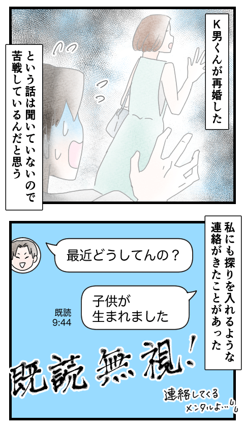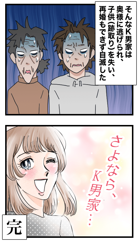 もちこの強烈なパンチに捨て台詞を吐き、電話を切ったK男。大学生の頃から騙され、振り回され、貴重な20代の数年を無駄にして泣き寝入りしたきたもちこ。しかし、その後K男家は、その傲慢さから自滅するのでした。