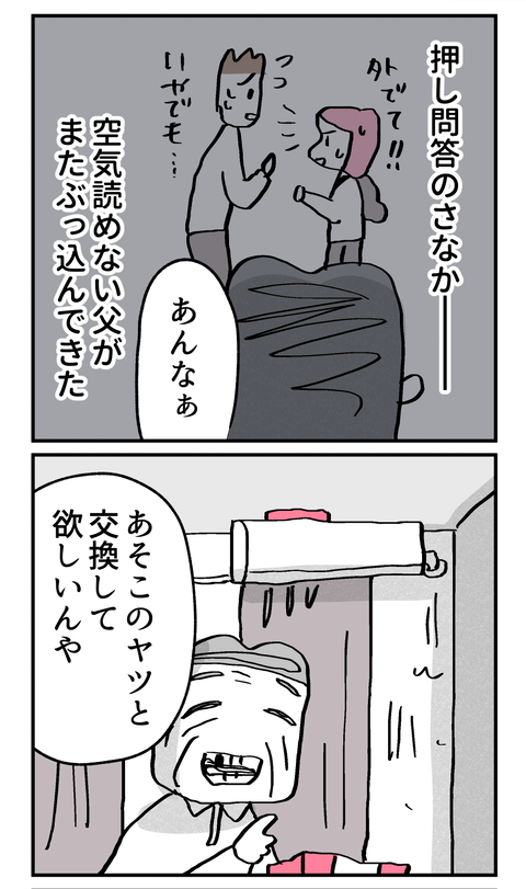 カサカサという音…よく見るとGのファミリーがお散歩していました。戦慄の光景にさすがのサト君も真っ青。しかし空気の読めない父がさらに口をはさみます。