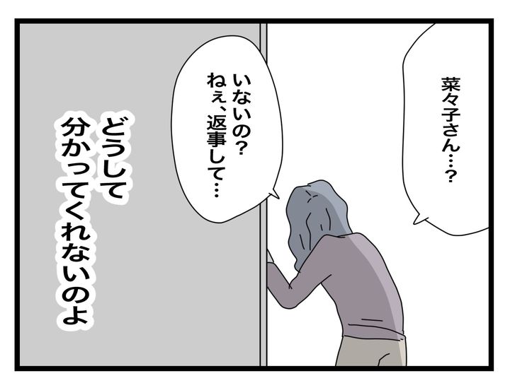 しかし帰宅後、突然義母が目の前に現れて…!? 自分勝手な言動をする義母にイライラした菜々子さんはついに「帰って」と声を荒げて…。菜々子さんにに本気で怒られた義母は、ショックを受けた様子。やっと話が通じた、と思ったが、やっぱり義母はこちらの話を理解していなかったのでした。