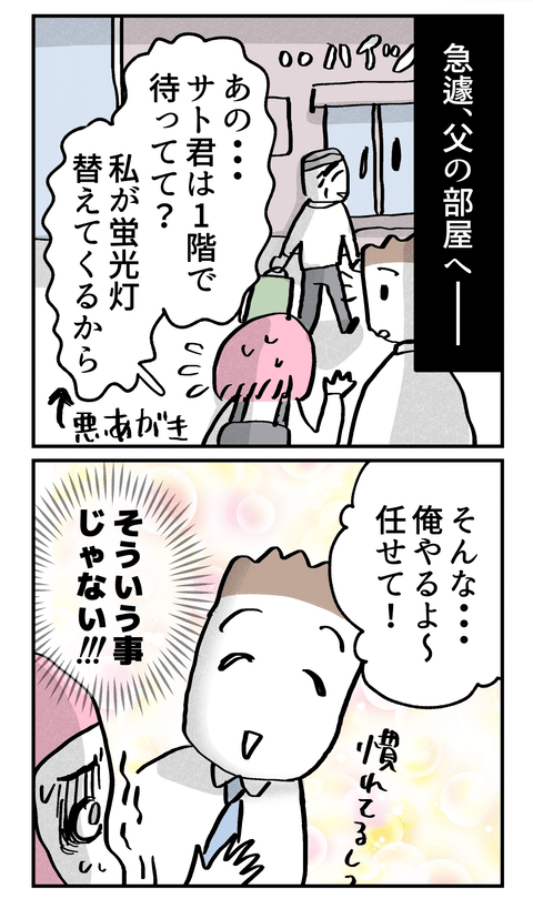 なんとか新幹線の時間を理由に父の部屋に行くのを阻止しようとするちえ子でしたが、優しいサト君はすぐに作業すれば大丈夫と言い、結局行くことになってしまったのです。