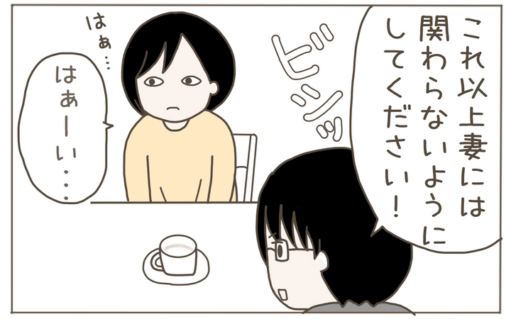 Sくんママを家に呼び出し、夫を交えて3人での話し合いがスタートします。夫の言葉に反論し、反省の色をまったく見せない様子のSくんママ。ついにはため息混じりで「友達になってあげたのに」とありえない言葉が飛び出すのでした。