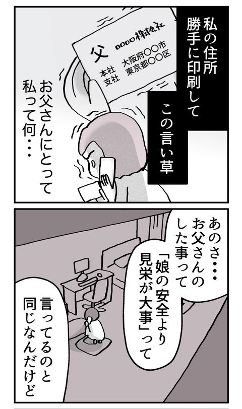 ちえ子が自分の住所が使われていることを知ったのは、名刺が同封された父からの手紙が送られてきた時。勝手に住所を印刷されるのは「怖い」と訴えても、「誰もそこまで気にしない」と父には話が通じないのでした。