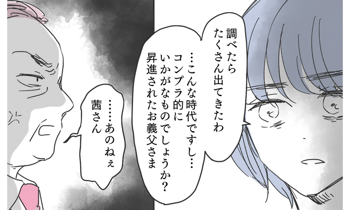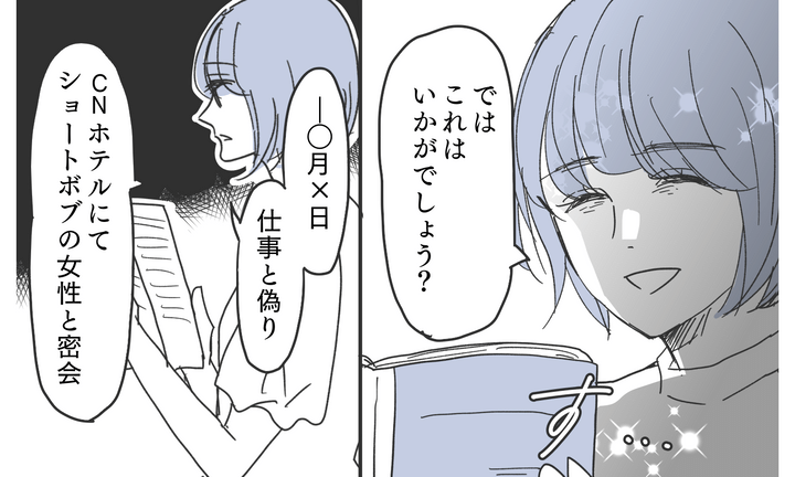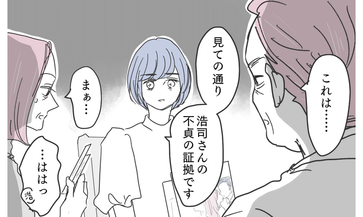 夜は「例の件」で遅くなると言いながらでかける浩司を笑顔で見送る茜。それから数ヶ月後、義父の昇進祝いに集まった茜たち。茜は子どもたちを先に帰らせると義父母の前に証拠写真を差し出し、「大人だけで話しましょうか」とほほ笑むのだった。