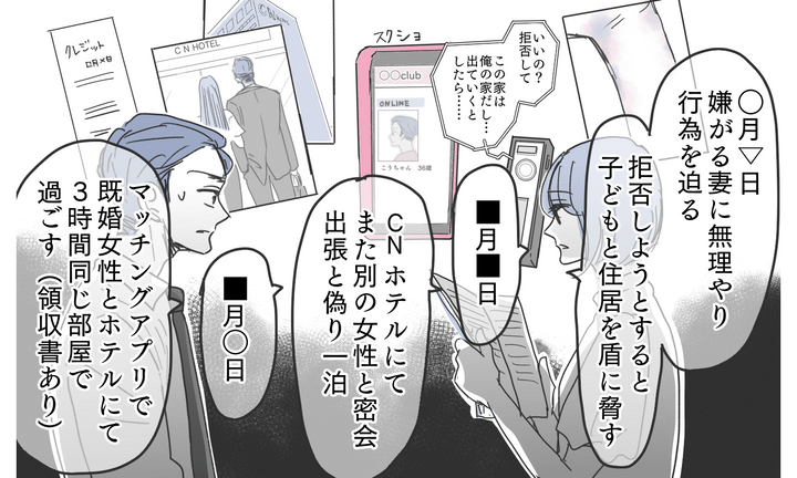 録音データ、ホテルに入る証拠、領収書…ありとあらゆる証拠を集め、法的に彼に「勝てる用意」をしてきました。