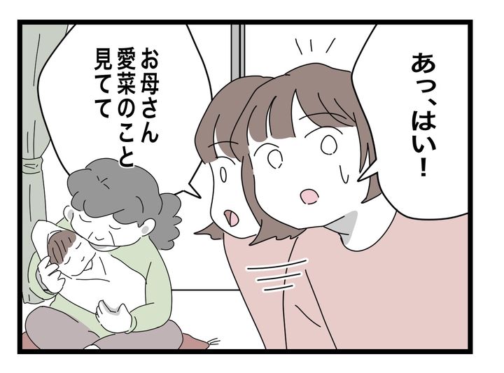 産後間もない体で赤ちゃんのお世話をする主人公・菜々子。極度の睡眠不足の理由は、菜々子の「産後うつ」を心配してやってくる義母にあり…。「産後は話し相手が必要」としゃべりまくる義母に疲れ果てた菜々子は、我慢の限界を迎え、実家へ「里帰り」することに。しかし、義母は嫁の里帰りを疑い、息子の家を訪問。菜々子に会えなかった義母は、帰ってきたらいつでも会えるよう、菜々子の家の鍵を勝手に持ち出していたのでした。