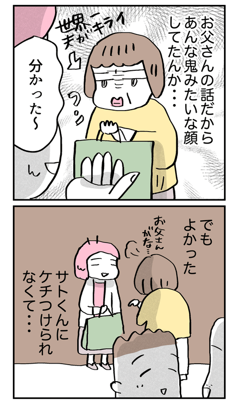 無事顔合わせが済んで気を抜いた瞬間、母が怖い顔で「ちょっとこっち来て」と言います。まさかサト君を悪く言うのでは? と警戒したちえ子は母をにらむのですが…