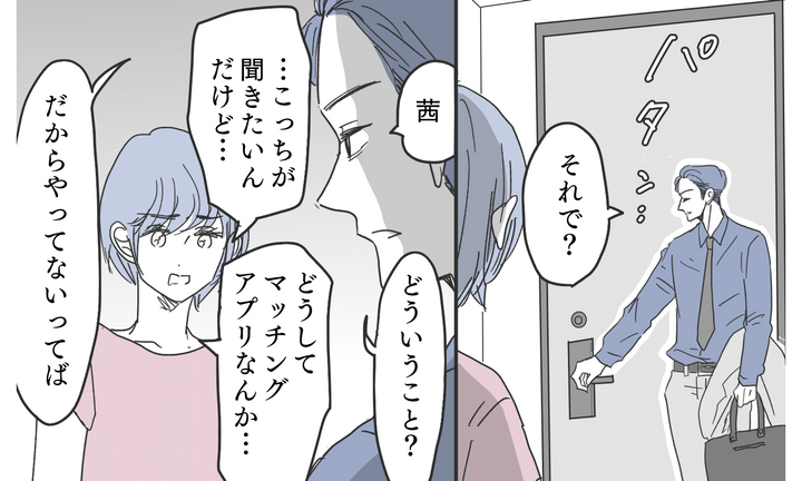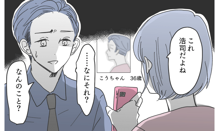 アプリで連絡をとりあう「あーちゃん」とホテルのロビーで待ち合わせする浩司。すると茜から、娘が熱を出したとの連絡が。浩司は優しい夫を装いつつ仕事で帰れないと説明する。電話を終えた浩司はうまくあしらえたと思っていたのだが、声をかけられ振り向くとそこにいたのは―…。
