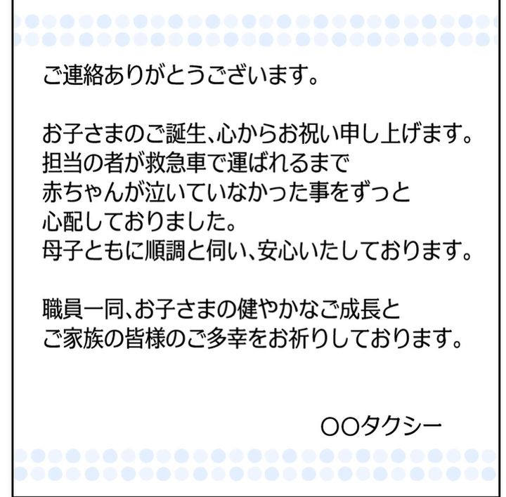 陣痛タクシーの方には会うことができずにいたのですが…、お礼のメールを送ると返信が!