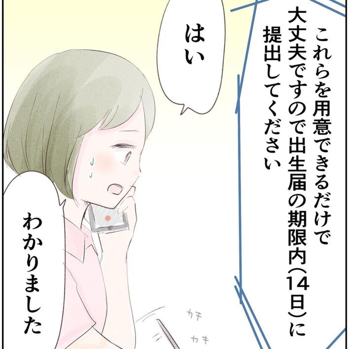 出生届について市役所に問い合わせてみると、胎盤が出てから産院に入ったことに驚かれる。そして必要書類をそろえてほしいと言われたのだが、その書類が多すぎて、入院していることもあり、気が遠くなってしまう。