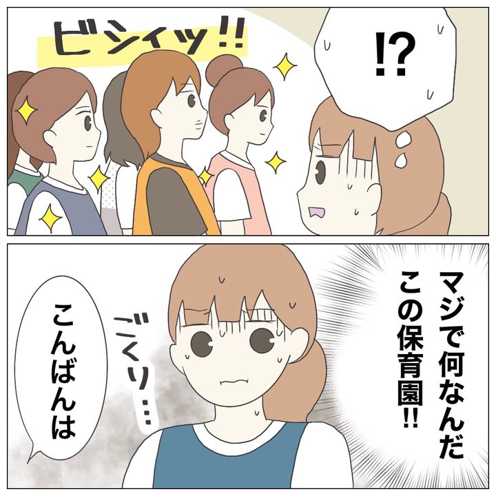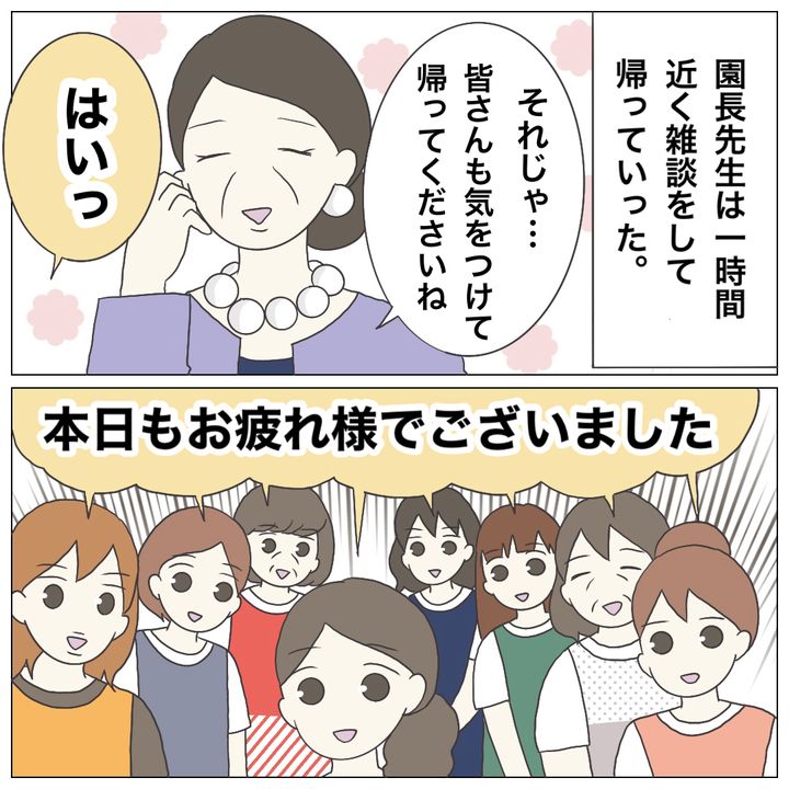 怒涛の9時間労働を終えたと思ったら、2時間後に園長が来るから挨拶するよう言われ、当然のように残業することに。園長が到着すると、先生たちは軍隊のように整列し始め…。