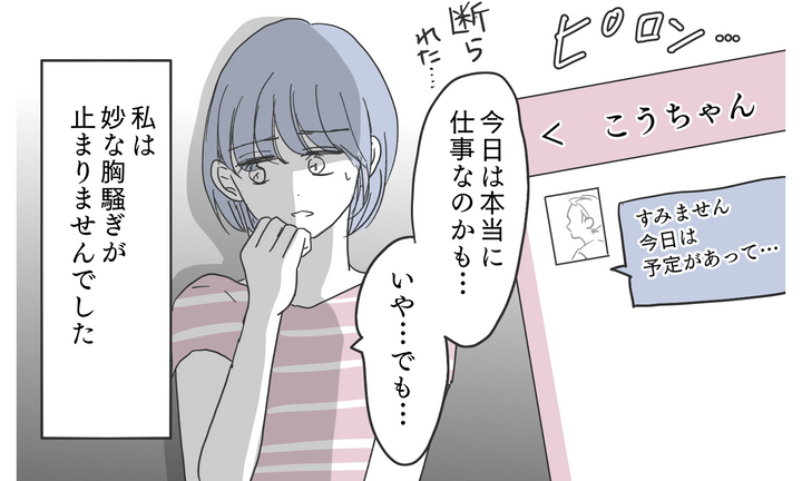 優しい浩司が嘘をついているとはまだ信じられない茜。その場でアプリから浩司に連絡すると、目の前で浩司がスマホを取り出し何かを送信した。すると茜のアプリに「ぜひ会いましょう」というメッセージが。
