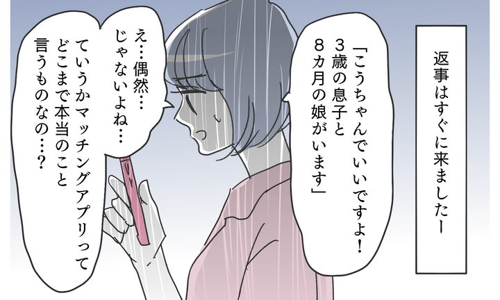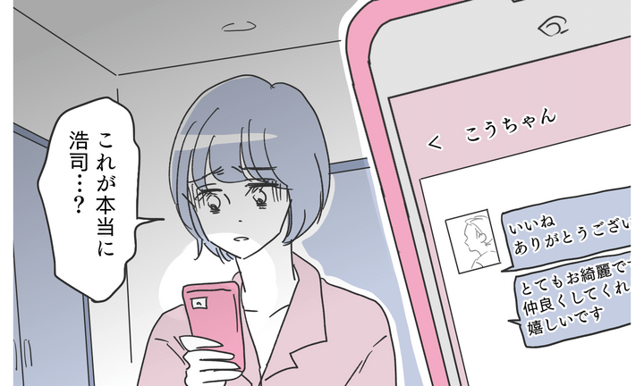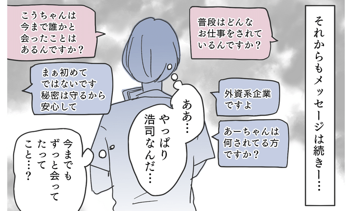 夫であろう人とのアプリ内でのやりとりは、一般的な挨拶から、お互いのプライベートな話へと移っていきました。聞けば聞くほど、どの回答も浩司と一致していて…。