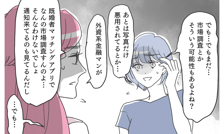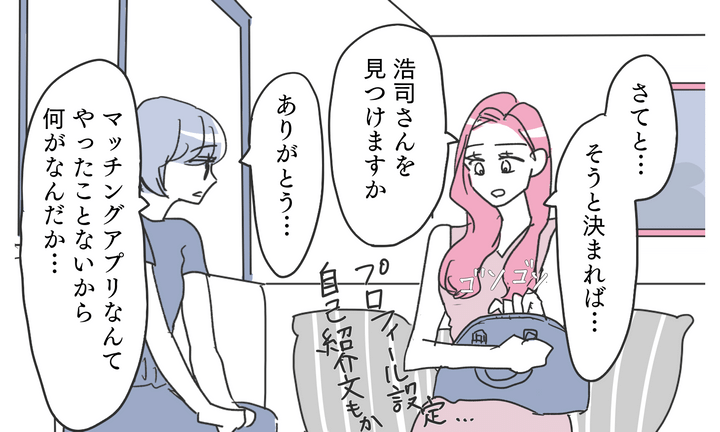 夫の浩司が夫婦の共有カレンダーに女性との予定を入れていたのを見てしまった茜は、再び沙織に相談していた。沙織はマッチングアプリに潜入し真実を確かめることを勧める。